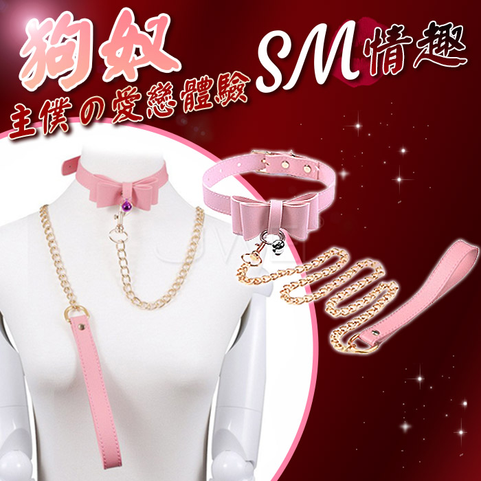 SM‧粉色蝴蝶結鈴鐺項圈+牽引金屬鐵鏈組合-鈴鐺隨機