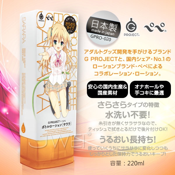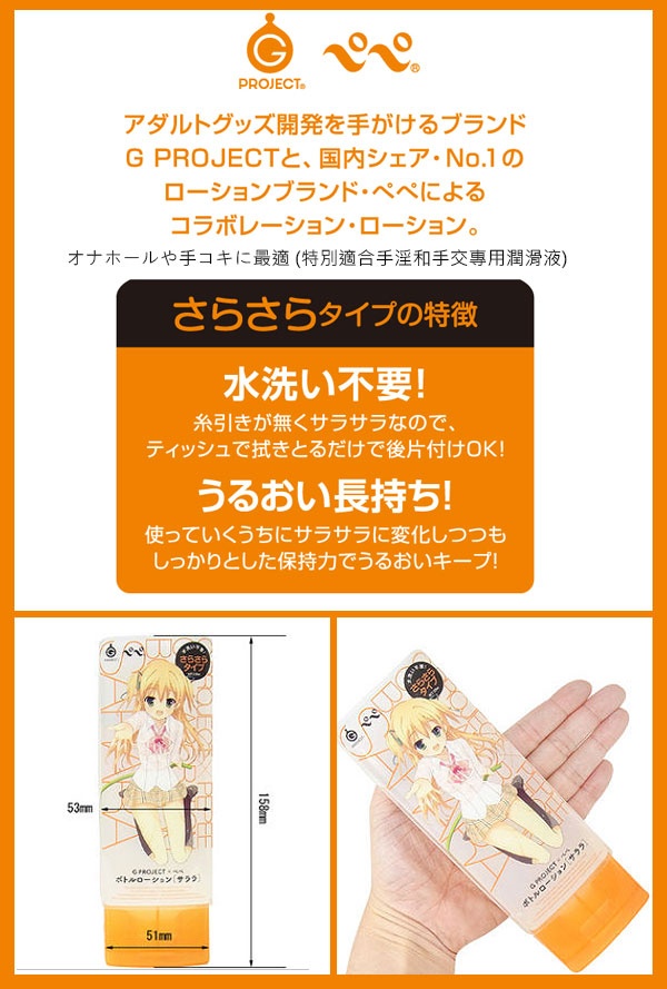 G PROJECTと、国内シェアNo.1のローションブランド・ペペによるコラボレーションローション。さらさらタイプは、水洗い不要!糸引きが無くサラサラなので、ティッシュで拭き取とるだけで後片付け!うるおい長持ち!使っていくうちにサラサラに変化しつつもしっかりとした保持力でうるおいキープ!オナホールや手コキに最適です!