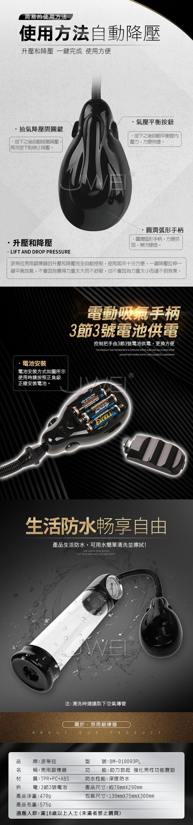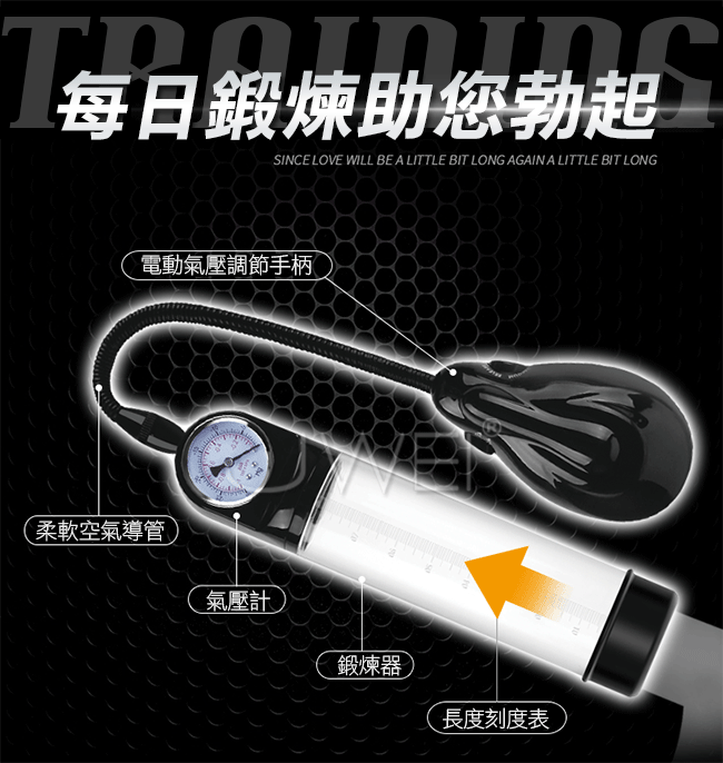 男用鍛煉器運用低壓按摩拉伸肌肉,促進血液循環,物理效果助您勃起。每日鍛煉強健平滑肌,反覆伸拉某肌肉群持續一段時間後,該肌肉群體積就會增大力量變強。採用降壓吸附拉伸肌肉擴大海綿體,增加肌肉血液循環運動以達勃起效果。附刻度及壓力計表直觀感受,讓您感受到成長的變化。升壓及降壓完全自動控制,使用十分方便一鍵降壓拉伸一鍵平衡方氣,不會因為力量太大而不舒服,也不會因為力量太小而達不到效果。電動吸氣手柄採電池供電更換方便。使用軟膠密封套TPR材質貼進人體柔軟不傷肌。本產品生活防水設計,讓您享受自由性愛!