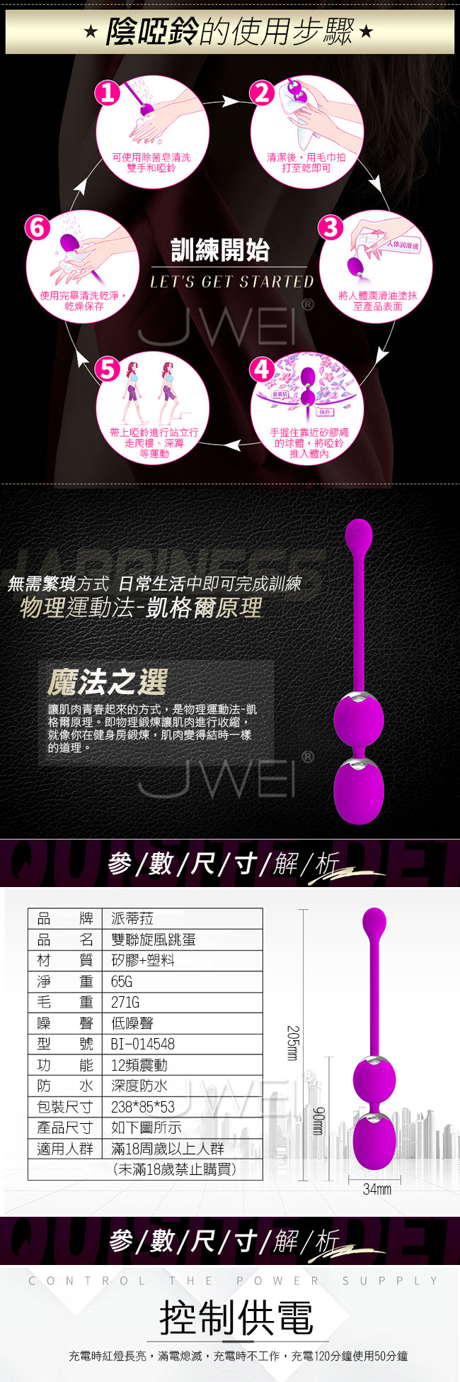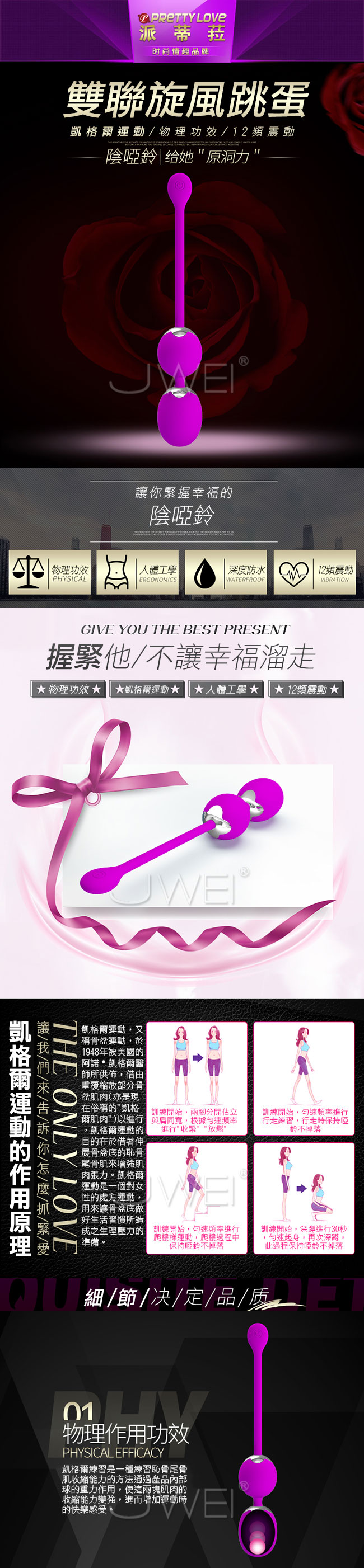 雙聯旋風縮陰啞鈴讓幸福不再輕易溜走,藉由凱格爾運動重覆縮放骨盆肌肉來達到增強肌肉張力的效果。擁有12段變頻設計,150馬達給您強勁動力,記憶功能可以讓你在下一次開啟的時候繼續之前的震感。採用順滑矽膠材質貼心工藝,觸感溫潤使用安全舒適。深度防水設計,讓您在水中享受愛的樂趣!低噪音設計,讓您在享受舒適的同時更享受安靜。徹底擺脫空洞重拾幸福!