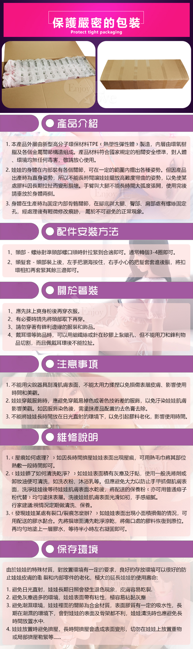 ※ 實體娃娃屬於個人親密衛生用品,經實際產品拍圖及品管後始可上架出售,所以一經拆封後恕無法接受退換貨!