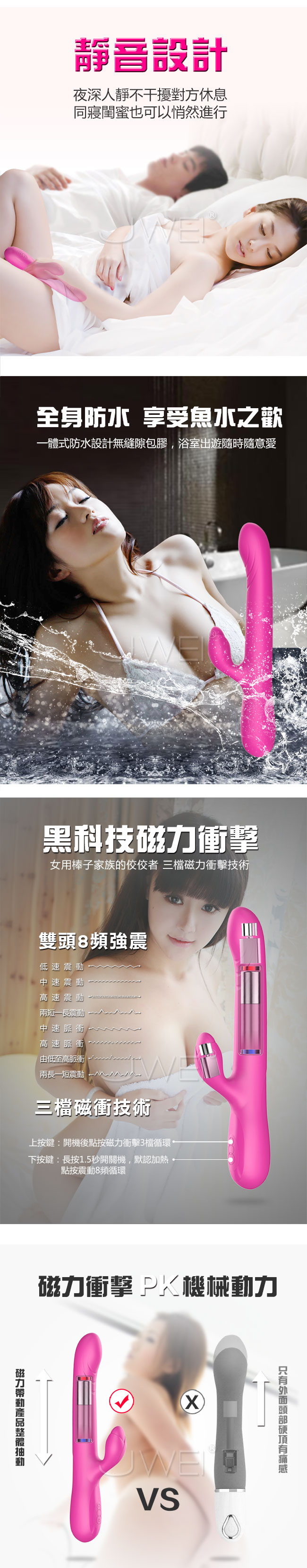 情竇初開G點按摩棒為全自動磁力快速抽插擁有3檔變速及8段變頻雙震動,徹底解放您的雙手。誘人的仿真設計符合人體工學抽插自如,如真人般進入您的身體。擁有智能加熱讓您感受最接近真人的體溫享受暖暖的愛。而棒身則採用柔軟親膚矽膠材質,讓您使用的安心觸感絲滑濕潤如肌膚般。此款根據亞洲女性生理結構設計不撐大私密處,讓您做個緊女人。擁有靜音防水設計讓您不論在哪都可盡情享受私密時光喔~