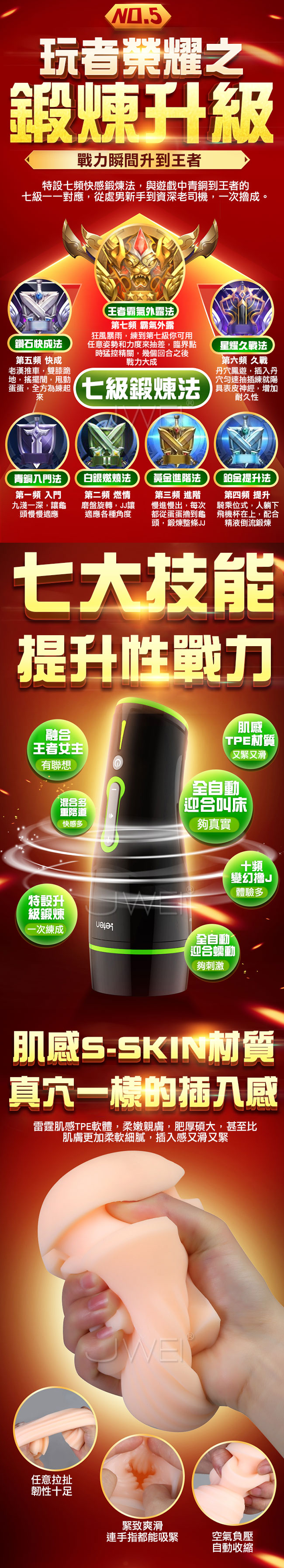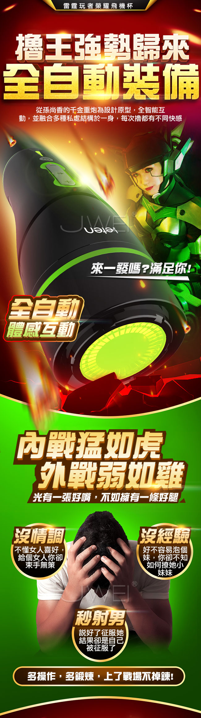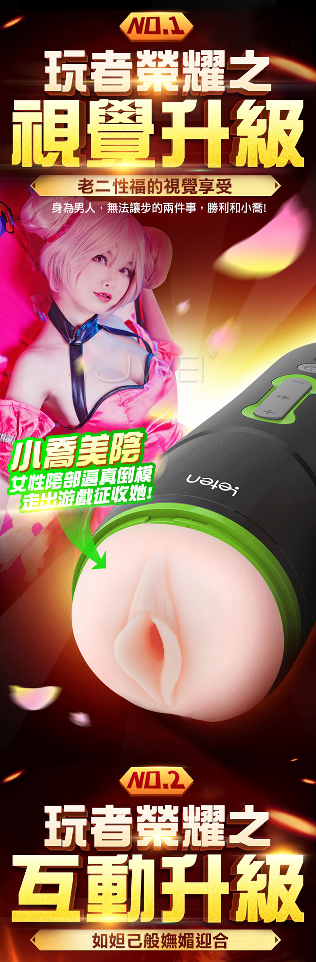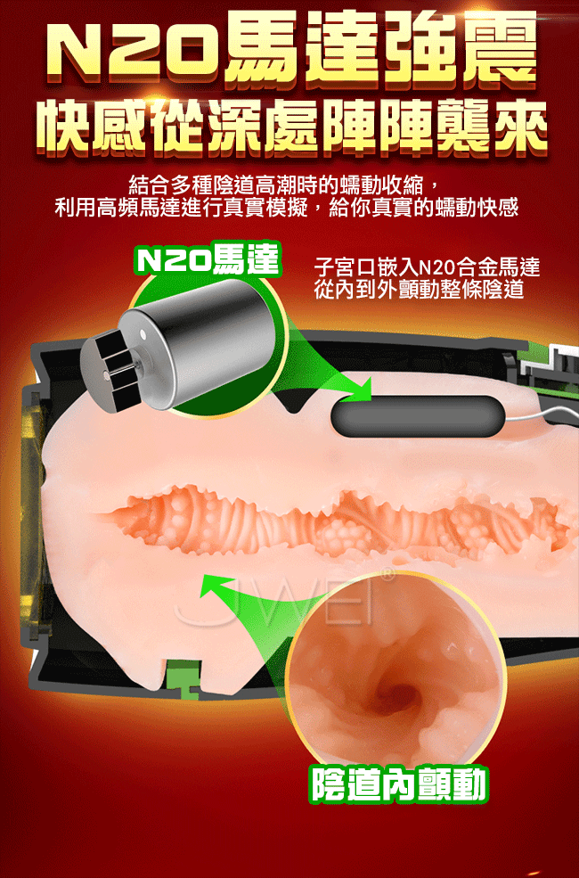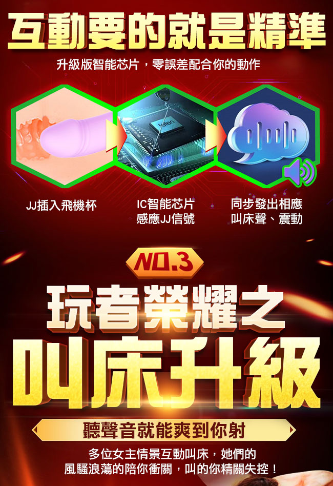 擼王強勢回歸,以孫尚香千金重炮為設計原型,全智能互動並融合多種私處結構為一身!擁有女性逼真陰部倒模及褶皺螺紋通道一插入便被緊緊吸住,增加您視覺及感官快感,還有如妲己般嫵媚迎合的互動功能零誤差配合您的動作。搭配多位女主情景互動叫床功能,陪您衝關叫的您精關失控!!採肌感材質親膚柔軟,讓您猶如真穴般的插入感!!