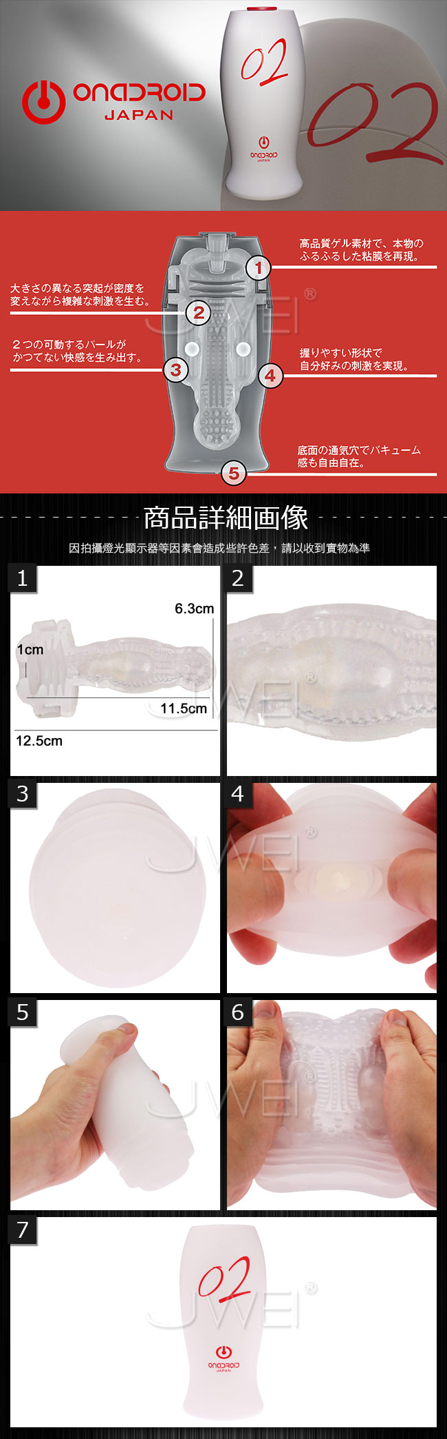 中型サイズで洗って繰り返し使えるカップホール、オナロイドシリーズに新作!! 高品質ゲル素材で、本物のあの、ぷるぷるした粘膜を再現した素材を採用しました。 内部には大きさの異なる突起が密度をかえながら配置されているので、複雑な刺激を生み出します。さらに、内部に埋め込まれた2つのボールが更なる快感を生み出します。 ゲルのプニプニ・プルプル感と、異なるサイズの突起と、ゴロゴロ感じる内部ボールの快感を堪能出来ちゃうオナカップです。 滑らかなカーブを描いて少しくびれたボディは手にしっくりと馴染んで握りやすく、握り具合で刺激の強さを自分好みに変化させることができ、底面の通気穴を開けたり塞いだりすることで、バキュームの調節も自由自在です。 期待を裏切らないというより、あまりの気持ち良さに、いい意味で裏切られちゃうオナホールです。