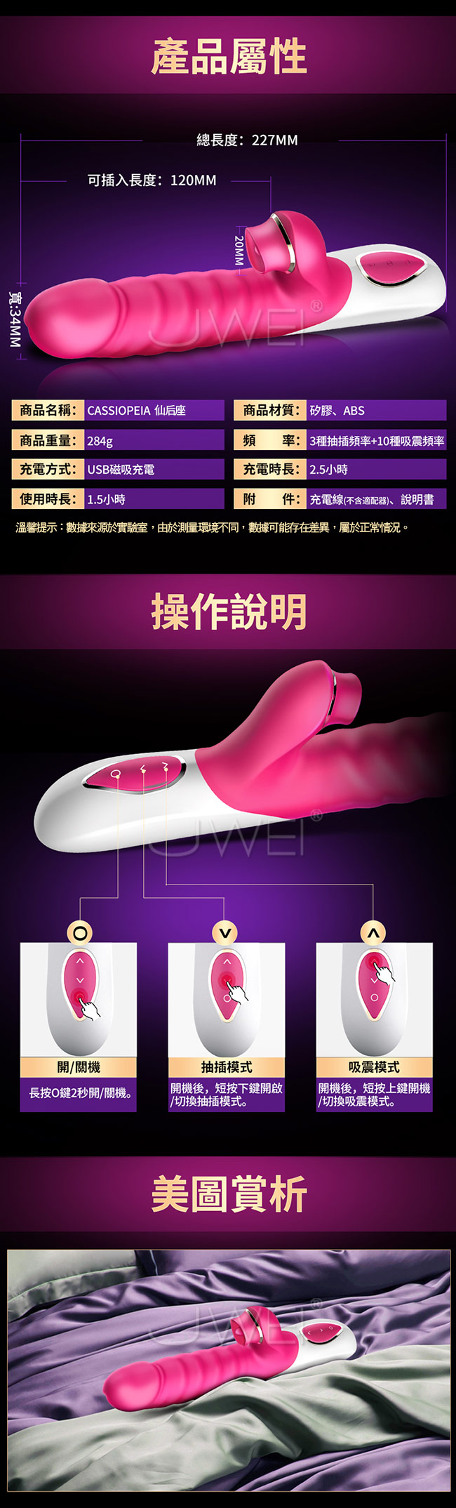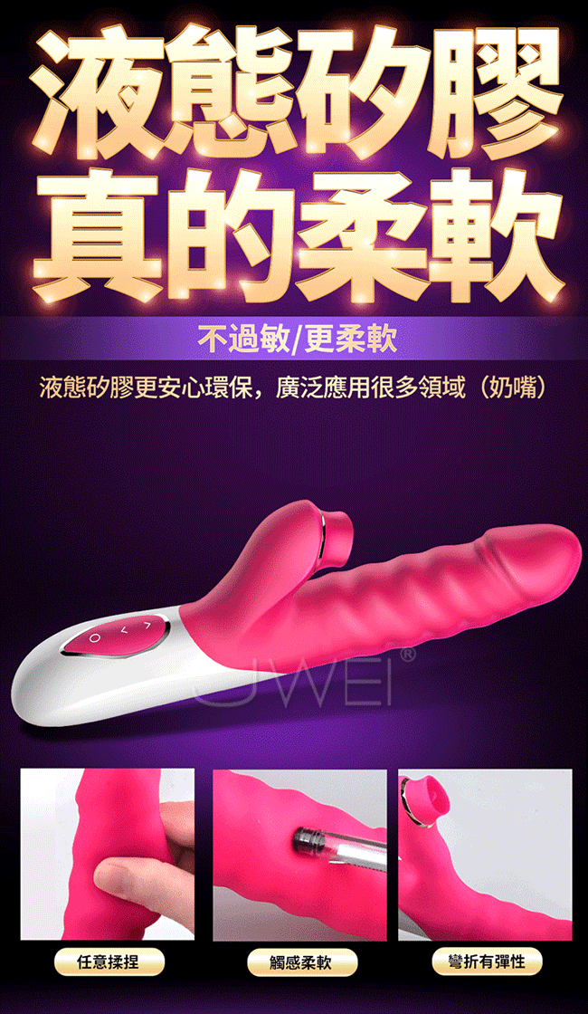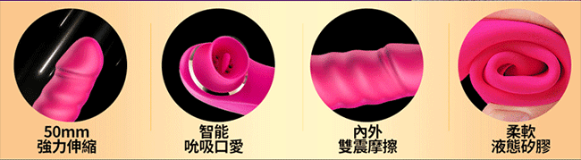 讓您從此告別單一刺激,讓您邊吸邊震混合爽一棒多用。多種頻率速度可多重內外刺激比單純伸縮刺激更強覆蓋您全身的敏感點喔~且採用液態矽膠製成使用上更柔軟更親膚,符合人體工學不怕撐大私密部位喔~擁有貼心靜音防水設計,只有呻吟沒有聲音,讓您可安心享受私密時間喔~