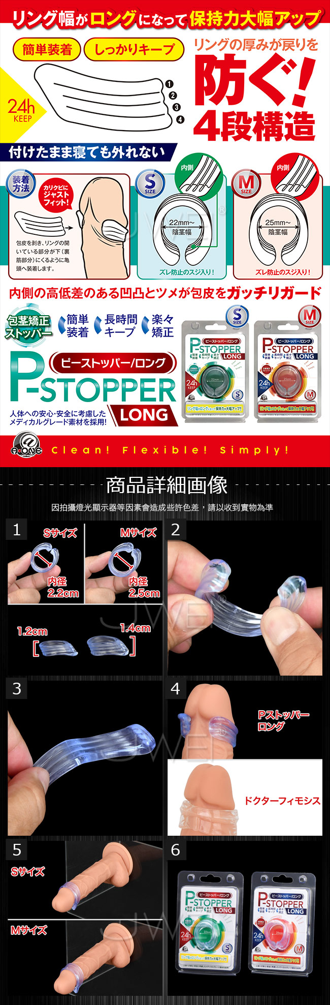 バレずにラクラク包茎矯正トレーニング!!皮を剥きリングを付けるだけの簡単装着!! Pストッパーシリーズに、リング幅が長くなって保持力が大幅アップしたロングタイプが登場。 リングの厚みが戻りを防ぐ4段構造と、内側の高低差のある凹凸の爪が包皮をガッチリガードするので、付けたまま寝ても外れない。 もちろん人体への影響に考慮したメディカルグレード素材を採用し、安心・安全に使用可能!!