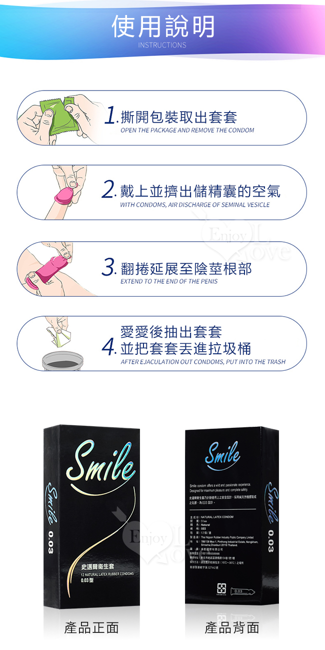 每個「Smile」乃針對使用上之安全設計,日商技術合作,採用純天然橡膠製成之乳膠,為0.03設計。