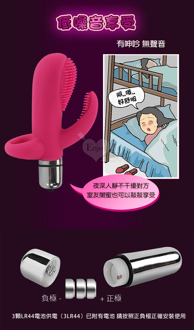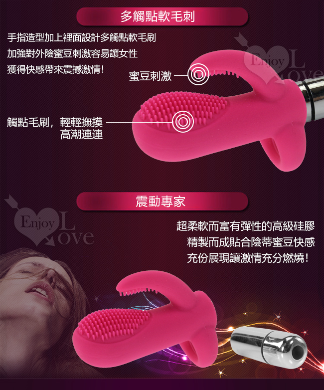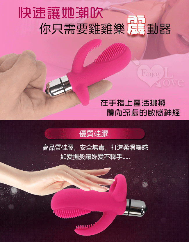 專為女性朋友設計自慰聖品,造型美觀又實用,而且在手指震動器上佈置至細細小小的軟毛刺,使用時貼切又刺激。