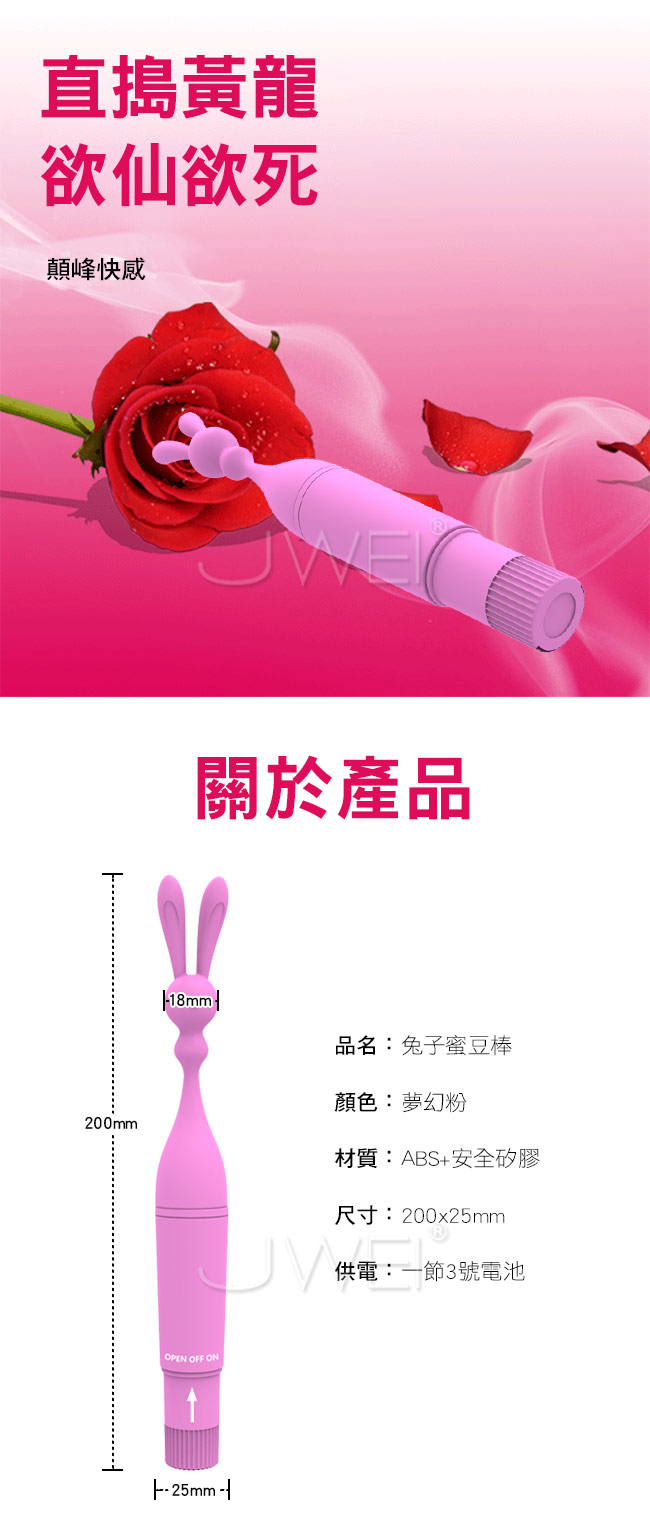 你沒有玩過的新玩具可愛萌兔造型高頻震動蜜豆棒,激顫單點集中刺激全身敏感點探索,高頻震動波集中深入蜜豆,讓你迸發全線高潮。低音防水功能如戀人的私慾體貼入微,重量比手機還輕,大小比牙刷還小,放在包包裡毫無壓力喔~