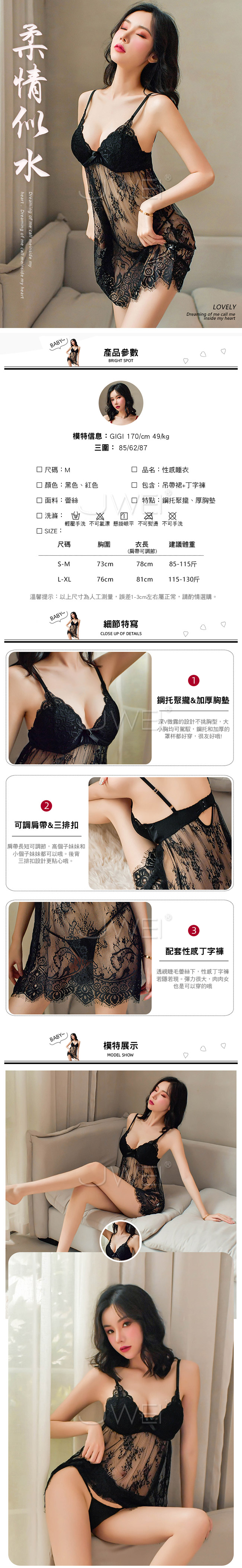 | 柔情似水.鋼托聚攏性感蕾絲吊帶睡裙(黑色)
