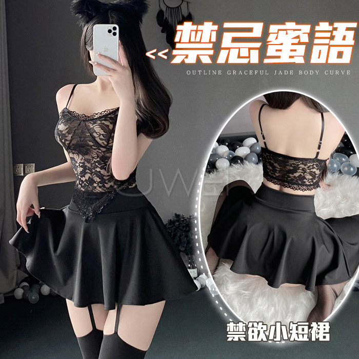 | 情趣睡衣!蝴蝶結髮箍水滴鏤空網紗分體四件式套裝