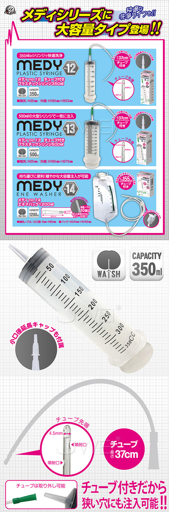 人気のMEDYシリーズにまたまた新しい仲間が加わりました。no.12は大容量を入れられるチューブ付きプラスチックシリンジで、お尻の洗浄はもちろんの事、様々なシーンに対応可能な多目的に利用可能な洗浄グッズ。取り外しできるチューブが付いているので、使い勝手もバツグン!!これ1つで清潔さを保てます。メディシリーズで、快適洗浄ライフを楽しもう。