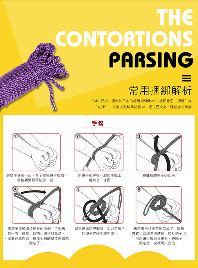 解鎖各種情趣姿勢,情趣多玩,百種姿勢任你擺佈,私享安全;束縛捆綁,細膩親膚,採用特殊強韌材質編織而成,表面加繞細密尼龍線、耐磨索段不變形,柔滑親膚且光澤感極佳!