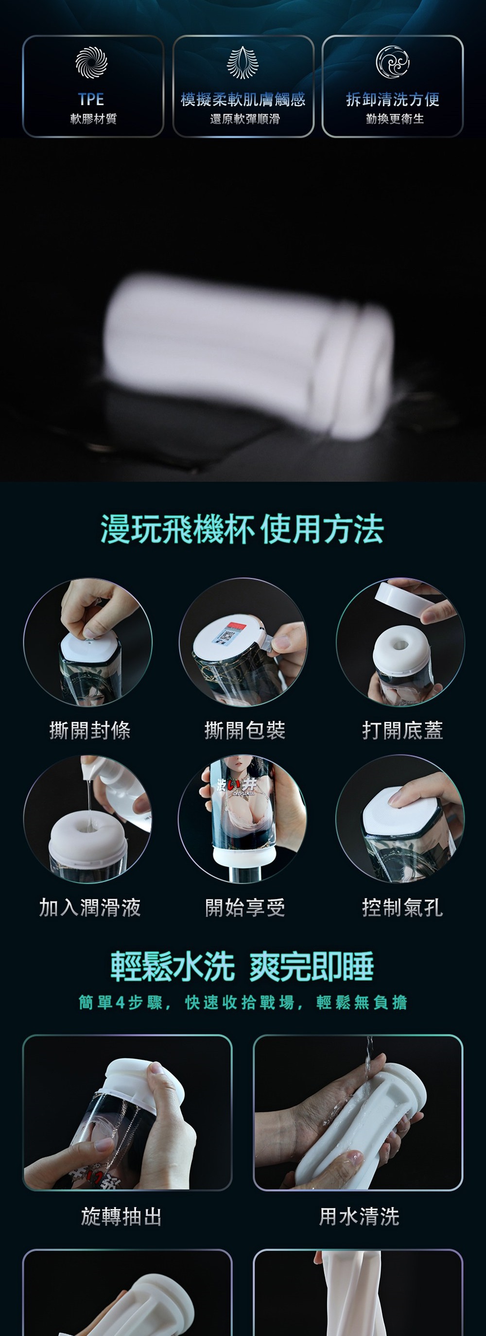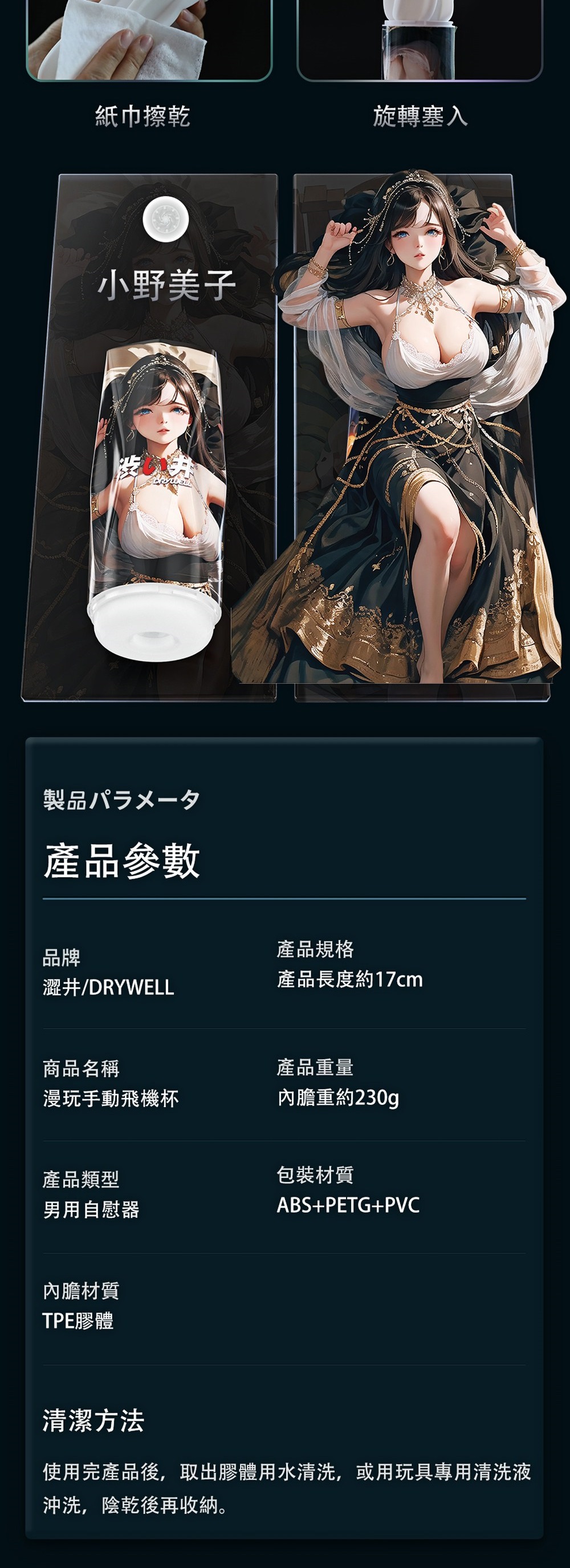 注意:請與潤滑液共用.並保存於陰涼處,欲重覆使用.用後清水沖洗。