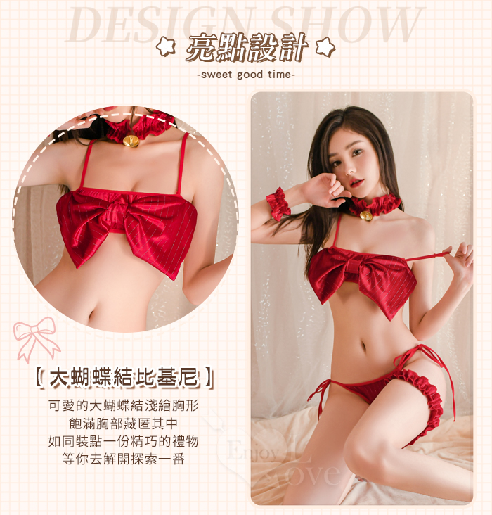 情趣比基尼!鈴鐺頸環大蝴蝶結美胸綁帶小褲六件式套裝