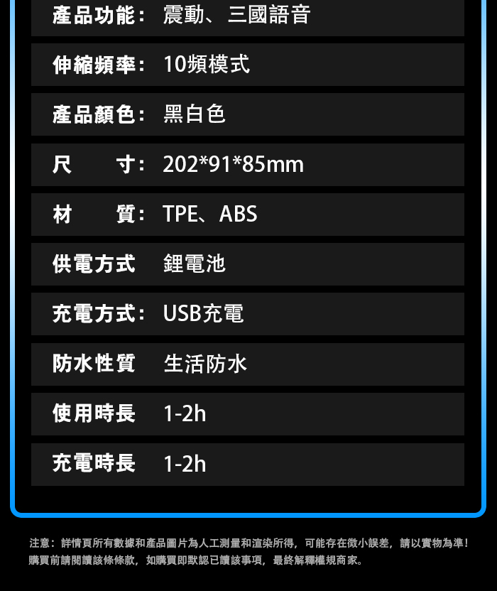 爽透全身的快感體驗 還擁有三國語音 讓你每次都可以體驗到不同的風情 物理鍛鍊 智能降低敏感度﹐讓你越練越大 產品規格 ■尺寸:大小詳如圖片標示 ■供電: USB充電 ■材質:ABS+TPE ■特色:10頻震動、三國語音