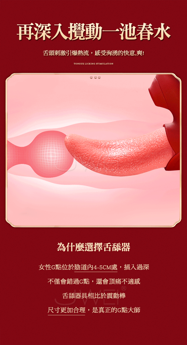 全新「升級」 舌吸入體雙重體驗,高潮一觸即發;CG 共震,内外高潮二重奏,讓高潮的 可能性,多了不止一點點!7頻吮吸,定位蜜豆包裹,每一頻吐吸滲透到身體深處;舌頭刺 激引爆熱流,感受洶湧的快意,爽!親膚細膩,軟糯不傷身;7頻震動,穿透級刺激,高頻 馬達釋放強勁動力,穿透皮膚,直達靈魂深處;全身防水,不懼濕身,在哪都能意亂情迷~