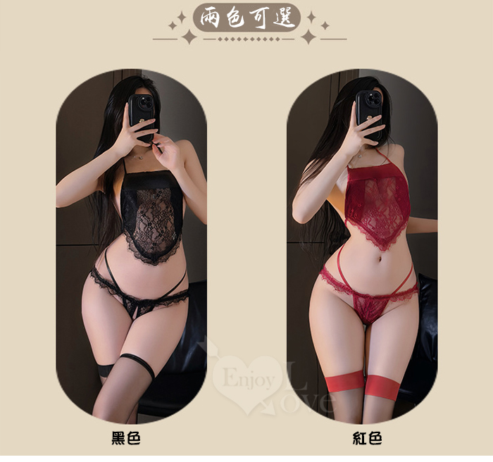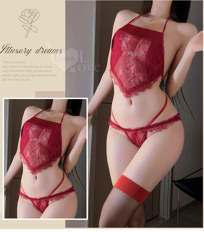 | 情趣肚兜!睫毛蕾絲透視美背細帶性感開襠T字褲三件組﹝黑﹞