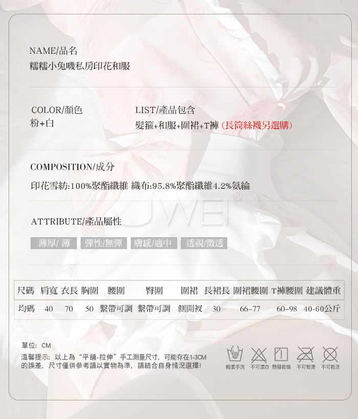 ■內容物:髮箍+和服+圍裙+T褲 ■適穿尺寸:FREESIZE ■彈性:無彈 ■未撐開平量尺寸正負誤差1~2cm,1吋=2.54cm ■注意事項:基於保障消費者個人衛生,此貼身衣物恕不接受退換貨。 (如為商品本身暇疵,接受七日內換貨,請勿試穿,謝謝您)