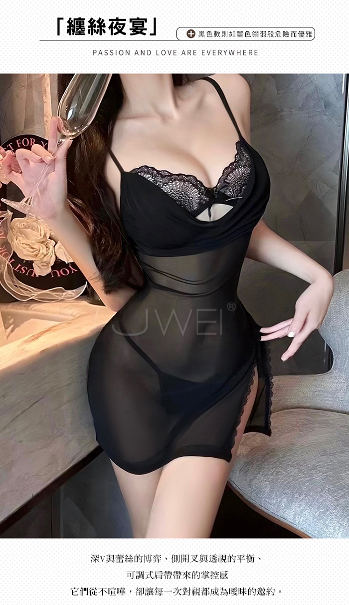 ►您現在的位置:首頁>月暮迷紗.性感裸紗蕩領透視側開衩細肩帶美背睡裙【睡裙+T褲-黑色】