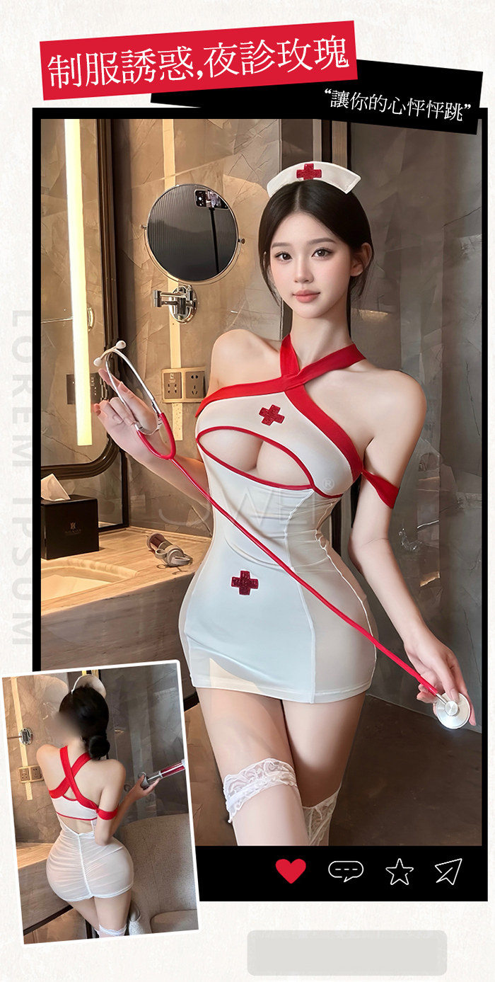 ►您現在的位置:首頁>夜診玫瑰.純欲下胸挖空交叉肩帶美背包臀小護士cos套裝【洋裝+T褲】